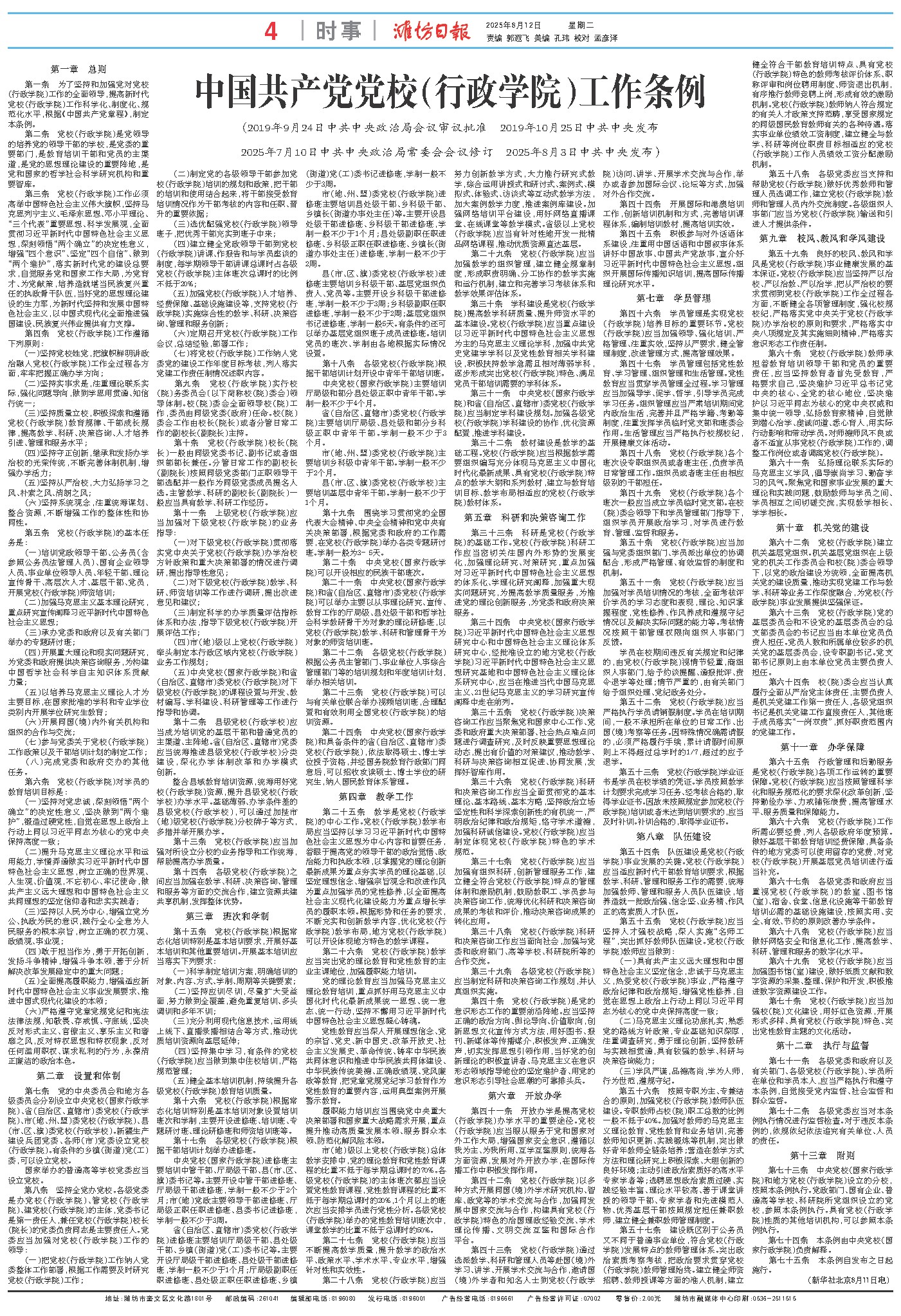 第一条 为了坚持和加强党对党校(行政学院)工作的全面领导,提高新时代党校(行政学院)工作科学化、制度化、规范化水平,根据《中国共产党章程》,制定本条例。