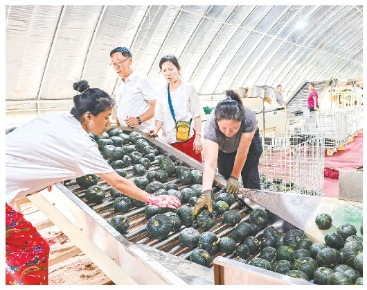 在仓储基地300米外的“本才种苗南瓜供种回收基地”,同样是一片忙碌景象,10多名工人忙着分拣南瓜,外地两名货主正在抽检南瓜质量。基地负责人刘本才说,他种植、销售贝贝南瓜已有10年,不仅掌握了种植技术,还不断引进优良品种提升品质,在大力发展种植基地的同时,为种植户提供种苗,并回收贝贝南瓜。全国各地市场长期与刘本才合作的货主有30多人。贝贝南瓜耐储存、易运输,销售风险相对较小,他每年销售量在4万吨以上。