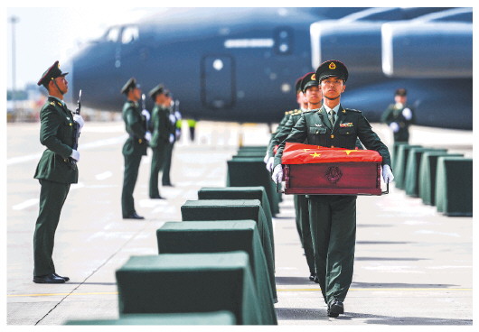 12日上午,空军运-20专机进入中国领空后,空军4架歼-20战斗机护航,运-20使用“跨江50”呼号,4架护航的歼-20使用“凯旋”呼号,“双20”列阵长空告慰革命先烈,表达崇高敬意。编队在机场上空通场,桃仙国际机场以“过水门”最高礼仪迎接英烈回家。