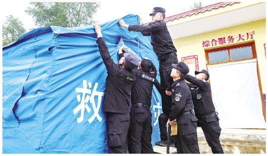 9月27日,在陇西县文峰镇中山村,公安民警在细雨中搭建抗震救灾帐篷。9月27日5时49分,甘肃省定西市陇西县发生5.6级地震,造成部分房屋不同程度受损。目前,帐篷、折叠床等救灾物资陆续运抵,抗震救灾各项工作正有序开展。
