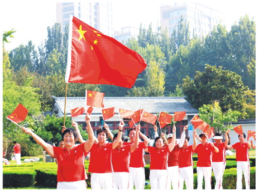 国庆节临近,城区的公园、广场已经热闹了起来,充满喜庆祥和的节日氛围。图为9月29日,市民们在潍坊植物园载歌载舞,用自编自导的文艺节目表达对祖国的祝福。