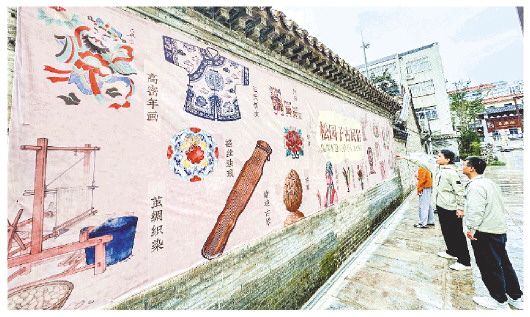 10月15日,在潍城区松园子街古民居的外墙,一幅长9米的潍坊元素贴画吸引了市民的目光。画面里,涵盖潍坊风筝、嵌银漆器、木版年画、老猫花灯、刺绣、核雕、面塑等内容,成为宣传潍坊地域文化的一道风景线。 记者 张驰 摄