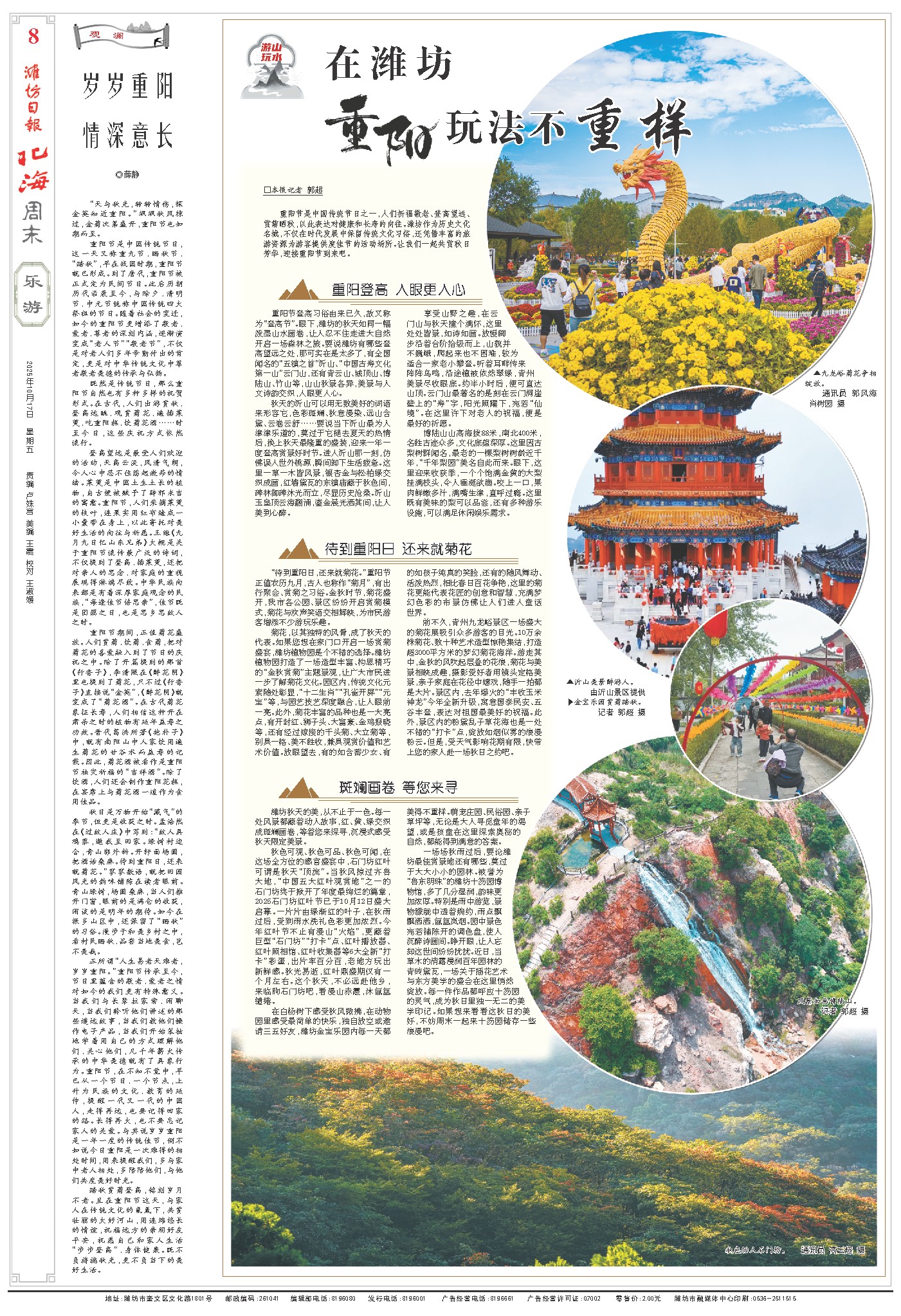 踏秋赏菊登高,铭刻岁月不老。且在重阳节这天,与家人在传统文化的氤氲下,共赏壮丽的大好河山,用连绵悠长的情谊,祝福远方的亲朋好友平安,祝愿自己和家人生活“步步登高”、身体健康。既不负旖旎秋光,更不负当下的美好生活。