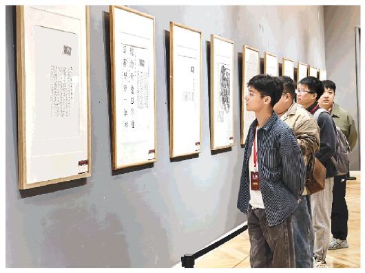 10月18日,齐陶遗珍·新见战国陶文名家题跋展在于希宁艺术馆一楼展厅开展。此展览作为第五届陈介祺艺术节十大高端展览之一,为专家学者以及广大市民呈现了一场金石文化盛宴。图为市民在参观展览。 记者 郭超 摄