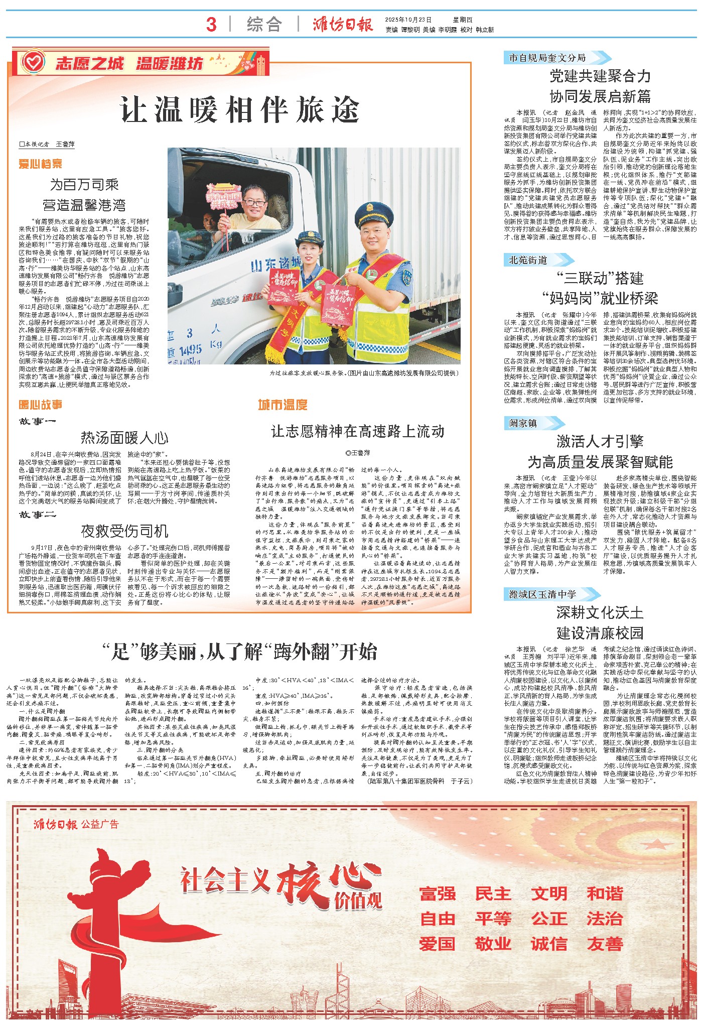 让温暖沿着高速流动,让志愿精神在这座城市扎根生长。1094名志愿者、29728.1小时服务时长、近百万服务人次,在潍坊这座“志愿之城”,高速路不只是顺畅的通行道,更是被志愿精神温暖的“风景线”。