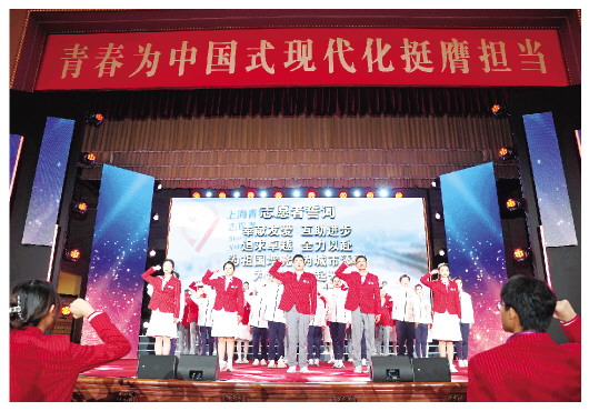 10月29日,第八届中国国际进口博览会志愿者上岗宣誓仪式在上海展览中心友谊会堂举行。据悉,本届进博会将于11月5日至10日在上海举办,志愿者将服务于现场引导咨询、展会注册管理、新闻宣传辅助、交易数据统计、医疗卫生辅助等岗位。 (新华社发)