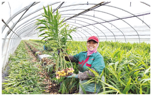 干劲,既来自于对劳动收入的认可,也来自于亲手挖出了一块块好姜,所感受到的丰收的喜悦。“这里的姜用栽培基质袋种,不下地;袋里都是发酵大豆、木头粉等混合成的固体基质,不用土。看看这姜,好看又好闻,质地还紧实,品质确实好。”张美红拿起一块刚出土的鲜姜说。