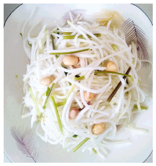 五、装袋:将切好的辣丝、萝卜丝放入盆中搅拌均匀,加入生花生米、熟食用油、鲜姜、大料、醋、盐等佐料和水,调和均匀后装入袋内,封好口,再装箱,每10袋1箱,待24小时后即可食用。