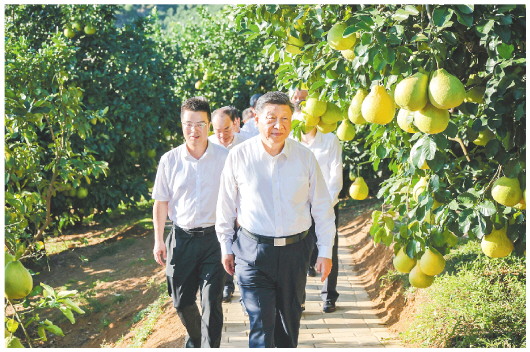 11月7日至8日,中共中央总书记、国家主席、中央军委主席习近平在广东考察。这是7日下午,习近平在梅州市梅县区雁洋镇南福金柚种植基地考察。 (新华社发)