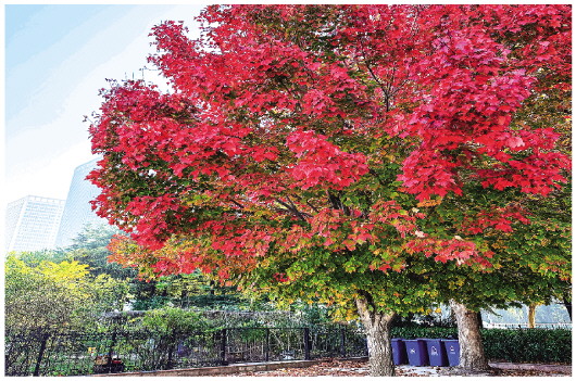 据了解,多年前,市农业科学院开展了北美红枫引种工作,并最终筛选出“夕阳红”等3个适合我省栽种的品种,通过山东省林木良种审定。“十月辉煌”是引进品种中表现较为突出的品种之一,春季叶片绿色,秋季呈黄色、橙色或红色,是北美红枫中变色较晚的品种,变色后期以红色叶为主期,持续时间较长,具有较高的观赏价值,观叶期为10月中下旬至11月底。 记者 张钊庆 摄
