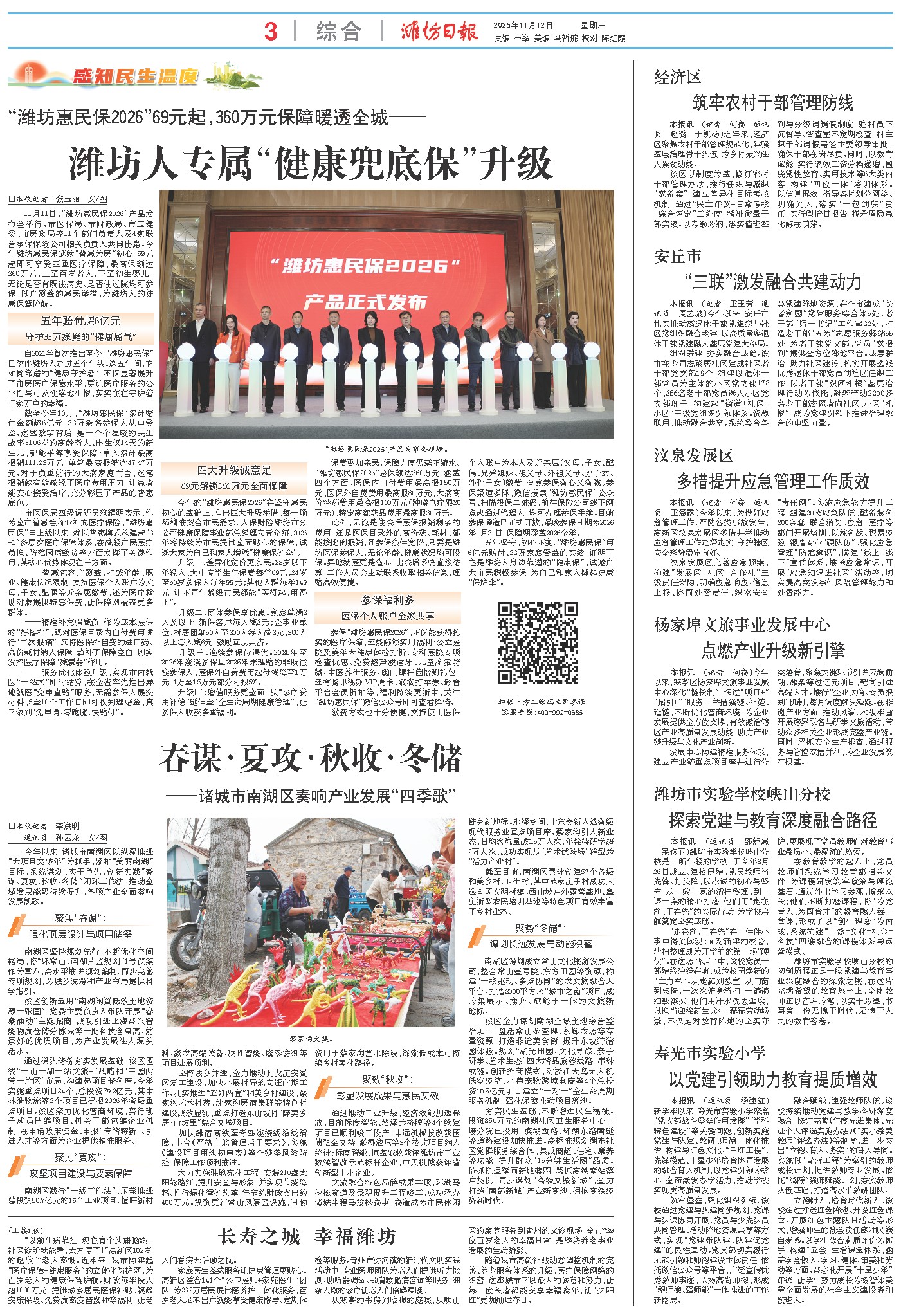 11月11日,“潍坊惠民保2026”产品发布会举行。市医保局、市财政局、市卫健委、市民政局等11个部门负责人及4家联合承保保险公司相关负责人共同出席。今年潍坊惠民保延续“普惠为民”初心,69元起即可享受四重医疗保障,最高保额达360万元,上至百岁老人、下至初生婴儿,无论是否有既往病史、是否住过院均可参保,以广覆盖的惠民举措,为潍坊人的健康保驾护航。