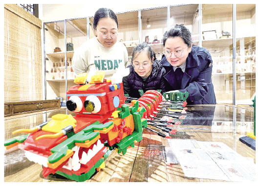 11月19日,在陈介祺金石博物馆,一件件用积木拼成的潍坊文创作品吸引了市民目光,龙头蜈蚣风筝、毛公鼎、编钟等积木文创作品让人们一边观赏,一边了解潍坊悠久的历史文化。 记者 张驰 摄