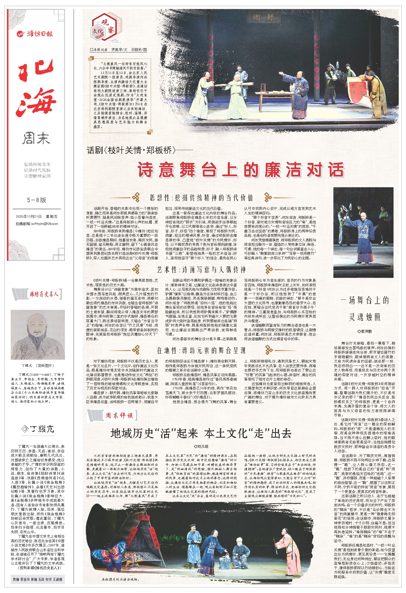 话剧《枝叶关情·郑板桥》采用倒叙方式,用一群人对郑板桥的“控告”开篇。整幕话剧为我们展示的,不仅是书中记录的那个“潍县饥民出关觅食,板桥感叹系之”的郑板桥,更是一个血肉丰满、充满矛盾的复杂个体,将文人的孤高与为父母官的张力表现得淋漓尽致。