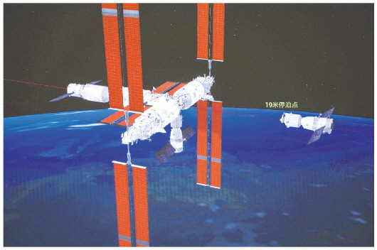 这是11月25日在北京航天飞行控制中心拍摄的神舟二十二号飞船与空间站组合体交会对接过程的模拟画面。