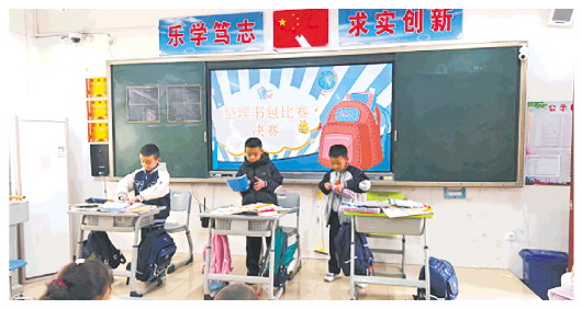 近日,潍城区健康街小学深化劳动磨砺教育,组织学生开展整理书包比赛,同步推出叠衣小能手、碗筷清洁赛等家务主题活动,学生在实践中练就生活技能,感悟劳动价值。图为学生们进行整理书包比赛。