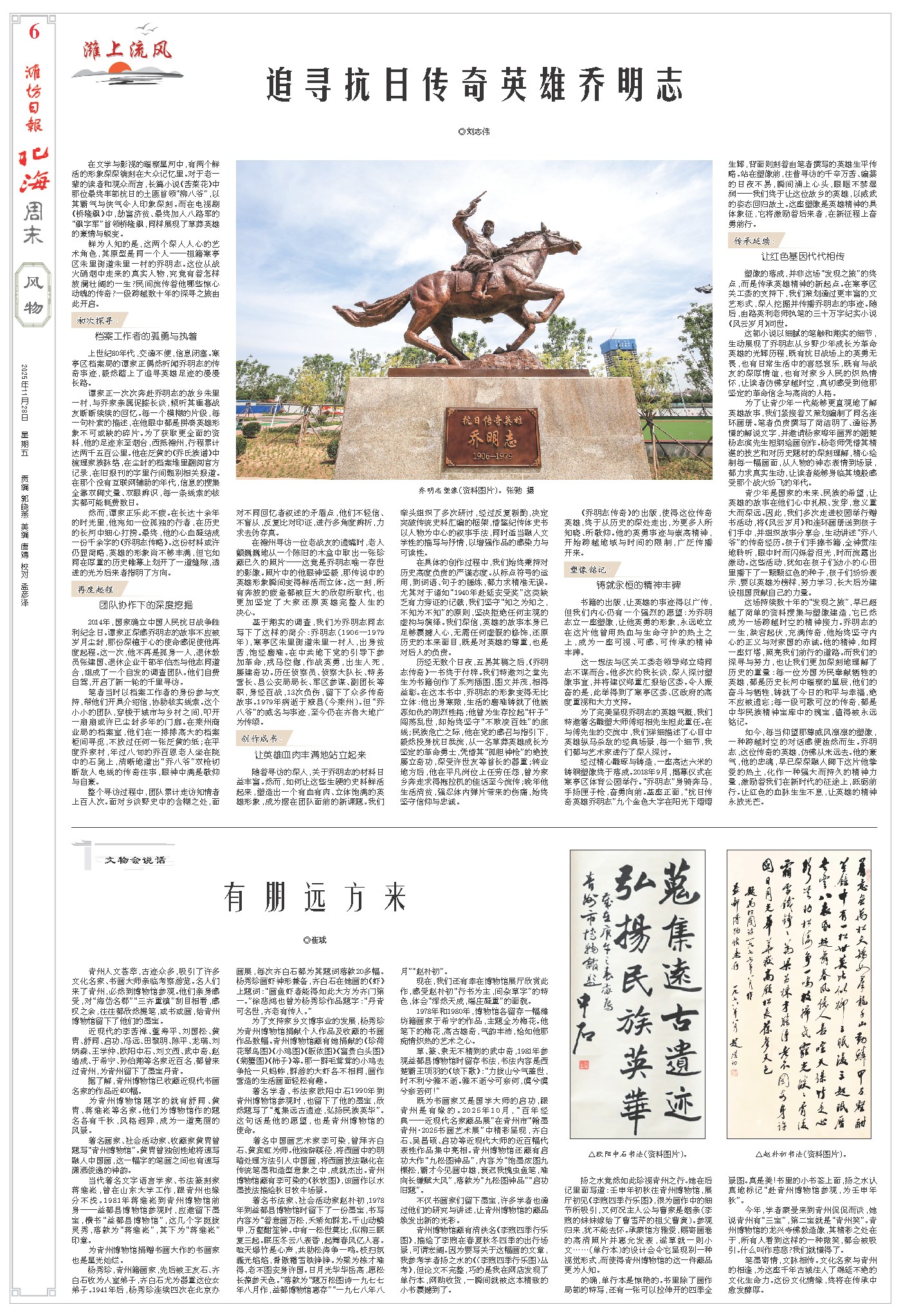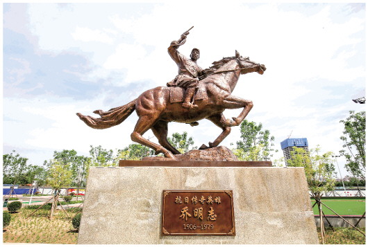 经过精心雕琢与铸造,一座高达六米的铸铜塑像终于落成。2018年9月,揭幕仪式在寒亭区体育公园举行。“乔明志”身骑奔马,手扬匣子枪,奋勇向前。基座正面,“抗日传奇英雄乔明志”九个金色大字在阳光下熠熠生辉,背面则刻着由笔者撰写的英雄生平传略。站在塑像前,往昔寻访的千辛万苦、编纂的日夜不易,瞬间涌上心头,眼眶不禁湿润——我们终于让这位故乡的英雄,以威武的姿态回归故土。这座塑像是英雄精神的具体象征,它将激励着后来者,在新征程上奋勇前行。