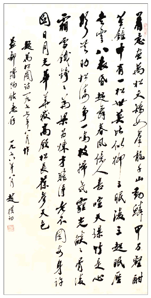 著名书法家、社会活动家赵朴初,1978年到益都县博物馆时留下了一份墨宝,书写内容为“着意画万松,夭矫如群龙。千山动鳞甲,万壑酣笙钟。中有一松世莫比,似柳三眠复三起。眠压冬云八表昏,起舞春风亿人喜。喧天爆竹是心声,共助松涛争一鸣。枝扫氛霾光焰焰,骨傲霜雪铁铮铮。为梁为栋才难得,老不图安身许国。日月光华华岳高,愿松长葆参天色。”落款为“题万松图诗一九七七年八月作,益都博物馆惠存”“一九七八年八月”“赵朴初”。