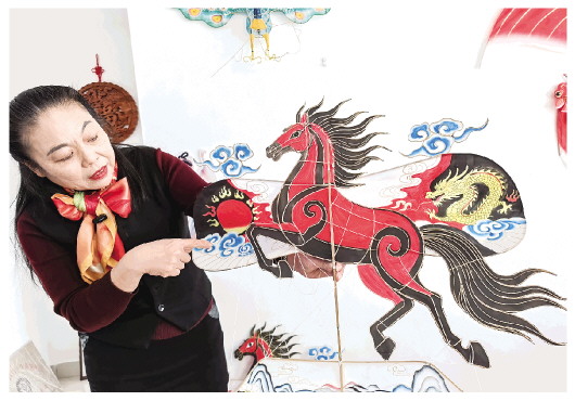 杨红卫对风筝的制作要求非常严格,在她看来,潍坊风筝的灵魂在于它是一项流传千年的手工技艺,只有保留传统文化色彩,并不断保持创新,潍坊风筝才能飞得更远、走得更稳。杨红卫也希望通过这组“龙马精神”风筝,借着时代的东风,为人们送去新年祝福的同时,让每根线和竹条讲出动人的潍坊故事,让更多人喜欢潍坊风筝。图为杨红卫展示“龙马精神”风筝。