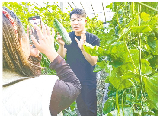 12月5日下午,记者在寿光市稻田镇崔岭东村崔国明的大棚里看到,个大饱满的羊角蜜甜瓜密密麻麻挂在瓜蔓上,2名带货主播正在现场拍摄短视频(如图)。