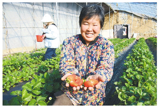 图为滕玉芹展示刚刚摘下的成熟草莓。