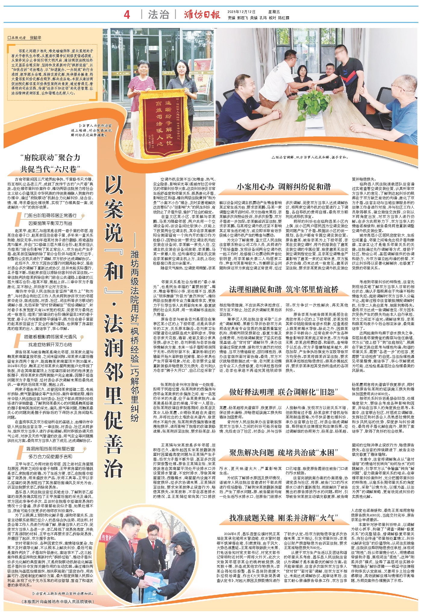 邻里之间朝夕相处,难免磕磕绊绊,家长里短的矛盾关乎着民生冷暖。从厘清权属争议到修复情感裂痕,从案件定分止争到引领文明风尚,潍坊两级法院始终立足基层治理实际,坚持和发展新时代“枫桥经验”,以“如我在诉”司法理念,以“知道就办、一办到底”的行为准则,抓牢源头治理,深耕实质化解,延伸服务触角,将大量邻里纠纷化解在萌芽、解决在当地。本版从潍坊两级法院化解邻里纠纷典型案例的角度,通过看得见、看得明的司法实践,传递“远亲不如近邻”的处世智慧,让法治精神浸润邻里,让和谐理念扎根人心。