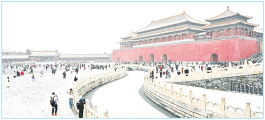 12月12日,游客在北京故宫赏雪。当日,北京迎来今冬首场明显降雪。