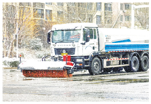 受冷空气影响,12月12日晚,我市迎来降雪天气,为有效应对雨雪恶劣天气对交通安全的影响,确保雪天辖区道路交通安全、有序、畅通,我市各级各部门以雪为令,立即启动恶劣天气应急预案,积极部署、迅速反应,全力以赴投入到保安全、保畅通工作中。图为大型除雪车作业中。 记者 郭超 摄