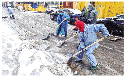 图④:奎文区东关街道苇湾社区组织党员干部、社区工作人员、志愿者开展扫雪除冰行动。 记者 刘晓杰 摄