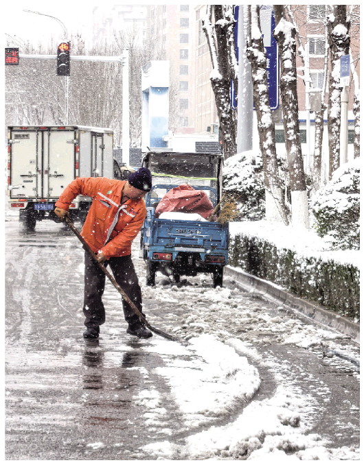 图③:环卫工人在城区乐川东街与潍州路路口附近清扫积雪。面对雪情,我市城管部门出动860台次机械设备轰鸣上路,铲雪车推开通路“先锋道”,7200人组成的清雪队伍手持工具,对路沿、路口等机械难及之处细致清理。