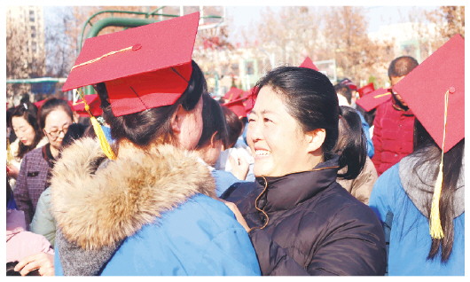 12月6日,高密二中举办以“十八而志,梦启新程”为主题的2023级高三学生成人礼仪式,激励全体高三学生努力成长为有理想、敢担当、能吃苦、肯奋斗的新时代的青年。图为家长为孩子戴上成人礼帽。 通讯员 蔡志华 摄