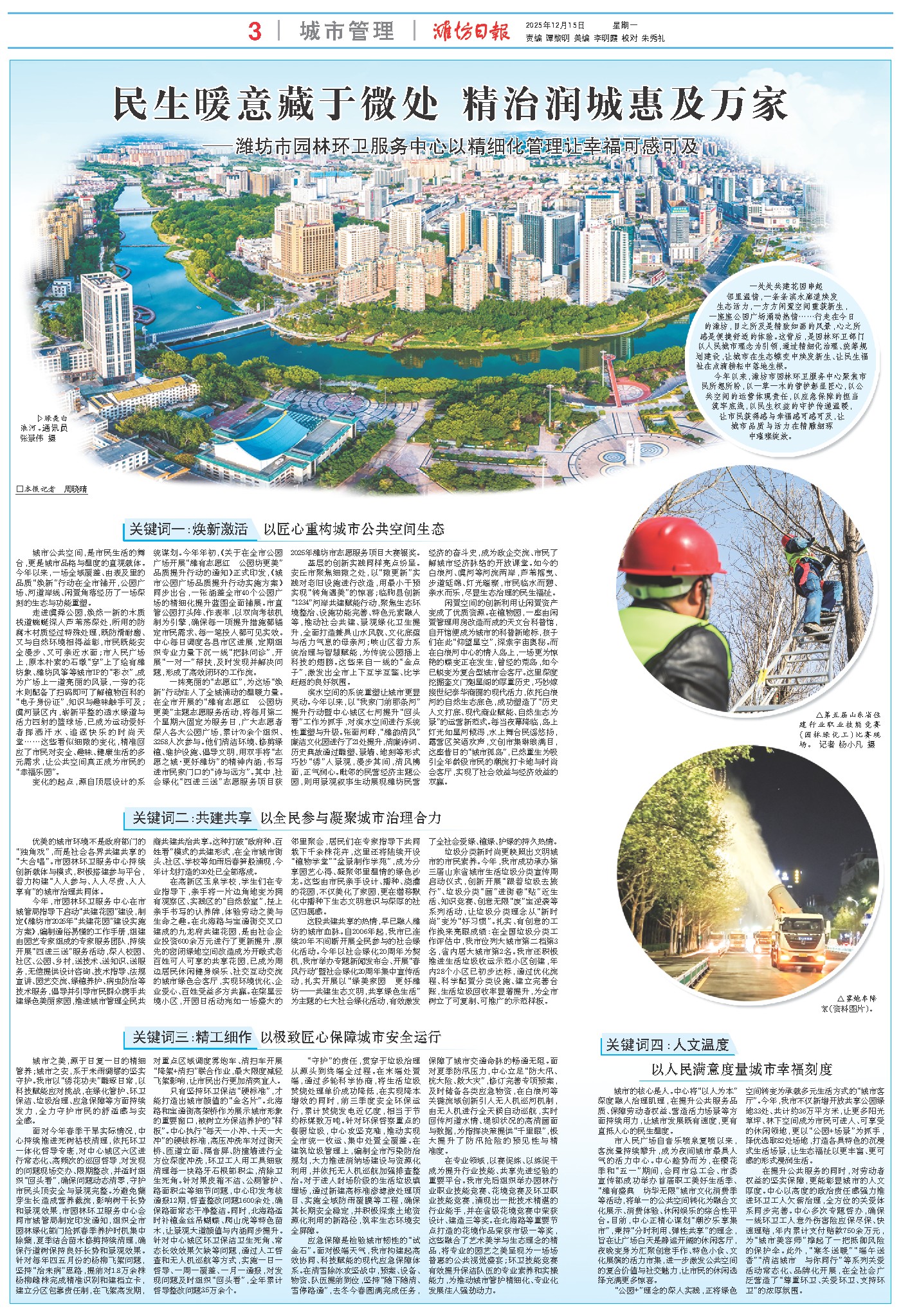 今年以来,潍坊市园林环卫服务中心聚焦市民所想所盼,以一草一木的管护彰显匠心,以公共空间的运营体现责任,以应急保障的担当筑牢底线,以民生权益的守护传递温暖,让市民获得感与幸福感可感可及,让城市品质与活力在精雕细琢中璀璨绽放。