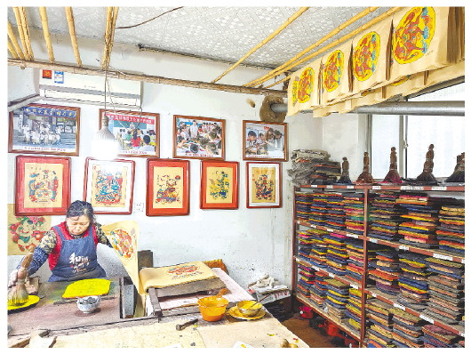 12月17日,杨家埠木版年画艺人在忙着印制年画。随着农历马年临近,杨家埠的木版年画艺人到了一年中最忙碌的时刻。近日,杨家埠木版年画代表性传承人杨乃东设计制作了《马上纳福·万事如意》木版年画作品,在浓厚的传统文化韵味中融入现代审美元素,作品一经推出就广受好评。 记者 郭超 摄