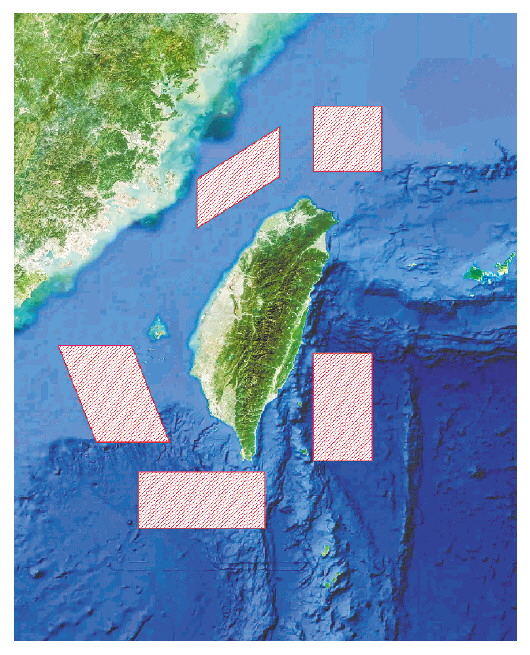 北纬21°58′00″、东经121°40′00″,北纬21°58′00″、东经122°28′00″,北纬23°23′00″、东经122°28′00″,北纬23°23′00″、东经121°40′00″四点连线。
