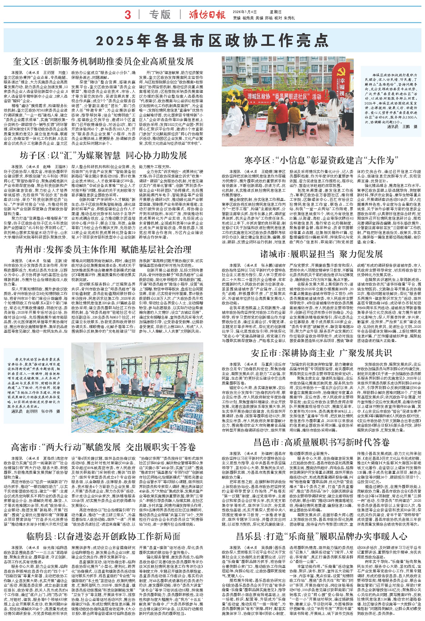 高密市政协以“社会治理强引领”行动为重点,推动“一进三研三带头”,为基层善治注入政协动能。组织“一进”:开展“政协委员进社区·请您来商量”活动,以“协商议事周”“委员接待日”等形式组织社区议事80余场,解决物业管理等群众身边“关键小事”460余项;实施“三研”:围绕“推进农村‘强基善治’专项行动”“创新城市社区网格化治理新模式”“规范完善业委会运管水平”等3项核心课题,组织相关界别委员和专家深入调研,提出具体建议40余条,为“大物业”集成改革、发展共富产业等政策实施提供重要依据;做到“三带头”:积极引导委员融入治理实践,在社区共建、乡村共富、民情沟通发挥带头作用,组织6名律师界委员担任社区法律顾问,推动委员企业帮建“共富工坊”18个,支持担任行业协会会长的委员设立“民情驿站”15处,进一步提升社会治理效能。