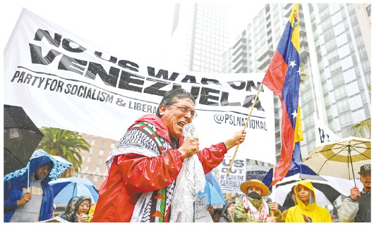 1月3日,人们在美国加利福尼亚州洛杉矶参加示威集会。当日,美国100多个城市举行示威活动,抗议美国对委内瑞拉发动袭击,反对以武力手段颠覆别国政权。 (新华社发)