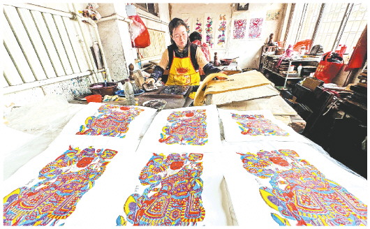 1月6日,在寒亭区杨家埠恒兴义年画店,年画艺人正在印制木版年画。随着春节的临近,在素有“年画之乡”美誉的杨家埠村,众多年画艺人正在赶印年画,绘稿、刻版、印刷等各道工序一丝不苟,一幅幅工艺精湛、色彩鲜艳、内容丰富的木版年画跃然眼前。这批年画将在春节前发往全国各地。