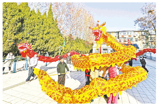 1月7日,记者在奎文区东关街道工福街社区采访时看到,爱好文艺的居民早早地开始了春节文化活动的排练,舞龙是大家着重排练的节目,舞龙时而上下翻腾,时而腾挪盘旋,一招一式间,将龙的精、气、神、韵展现得淋漓尽致。他们将在春节期间为广大社区居民奉献精彩的演出。 记者 张驰 摄