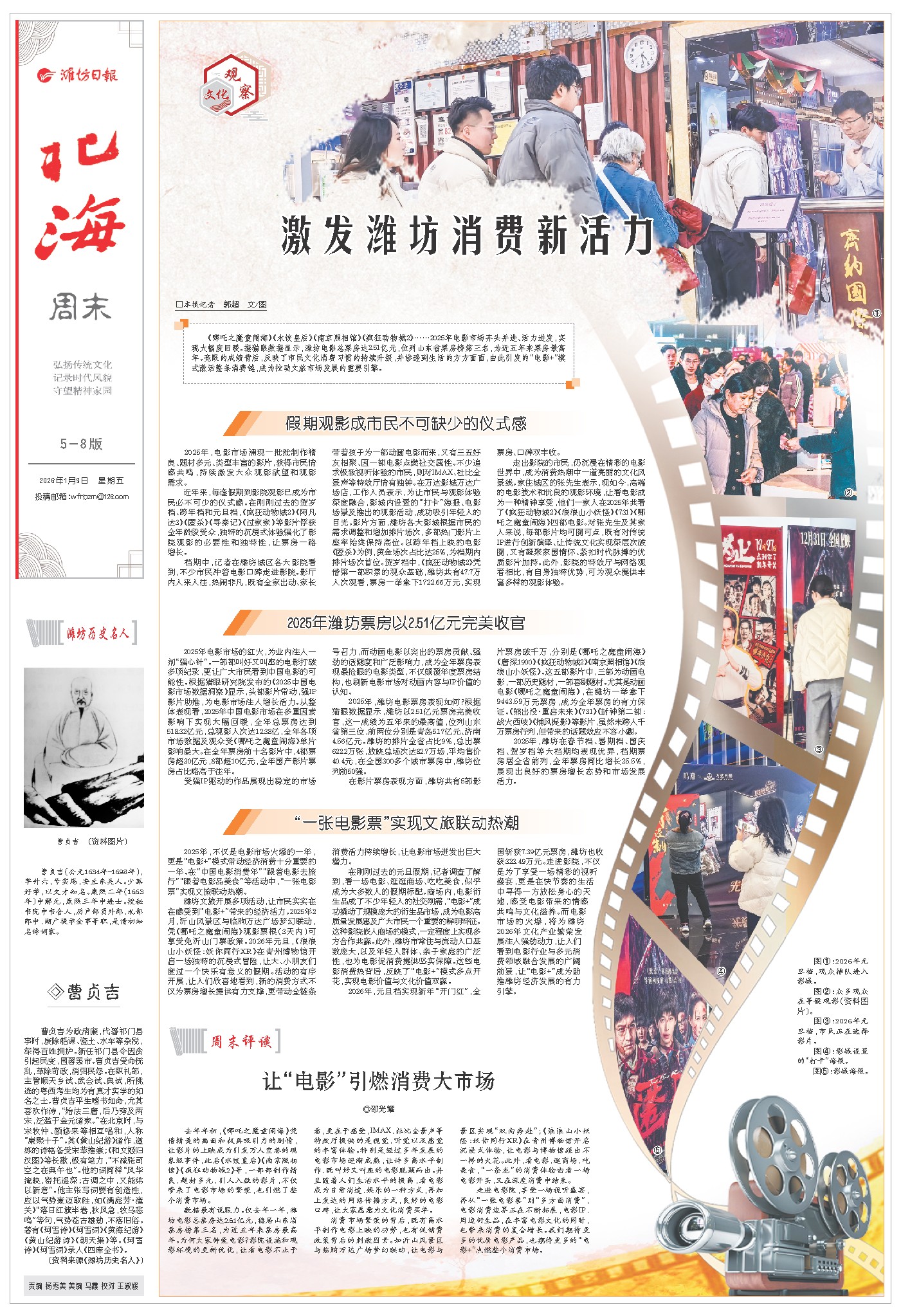 《哪吒之魔童闹海》《水饺皇后》《南京照相馆》《疯狂动物城2》……2025年电影市场齐头并进、活力迸发,实现大幅度回暖。据猫眼数据显示,潍坊电影总票房达2.51亿元,位列山东省票房榜第三名,为近五年来票房最高年。亮眼的成绩背后,反映了市民文化消费习惯的持续升级,并渗透到生活的方方面面,由此引发的“电影+”模式激活整条消费链,成为拉动文旅市场发展的重要引擎。