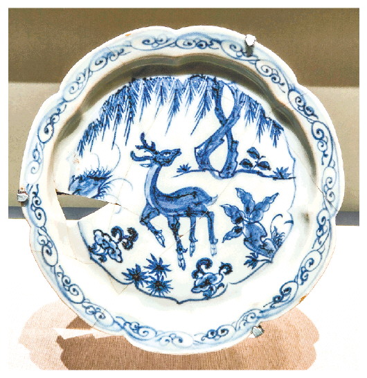 一同出土的元青花鹿纹盘,口沿呈七瓣葵花形,唇边外折,浅腹,平底无釉,釉质细腻莹洁,白中泛青,青花鲜艳且深浅过渡自然,积釉处少有黑斑,工艺体现了元代青花瓷的典型特征。盘心以青料绘两株交叉倒垂柳,树下立回首仰头鹿,三足踏地一足抬起,姿态灵动;边缘饰卷草纹一周,盘心边缘点缀兰草、山石等纹样,构图主次分明,纹饰布局浑然一体。器物通过自然景物与动物形象的结合,展现了元代青花瓷生机盎然的艺术风格与精湛的技艺。