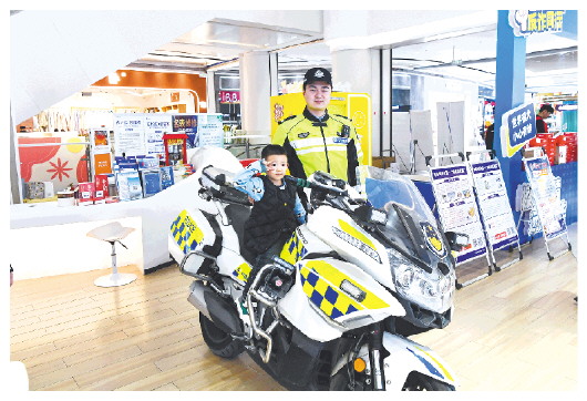 图③:1月10日,警营开放日活动现场,小朋友坐上警用摩托车当起“小交警”。 记者 张韶华 摄