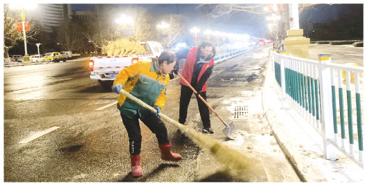 以雪为令,昼夜不息。当新年首场冬雪飘落潍坊大地,一场与风雪竞速、为市民护航的扫雪除冰攻坚战悄然拉开帷幕。从1月18日凌晨到1月19日凌晨,潍坊城管人闻雪而动、向雪而行,24小时坚守岗位。1400余台清雪机械开足马力,1.7万余名干部职工轮番上阵,用昼夜的坚守换来城市街道的畅行无阻,为市民出行筑牢安全防线。图为1月18日夜间,城管工作人员在清理道路积雪。