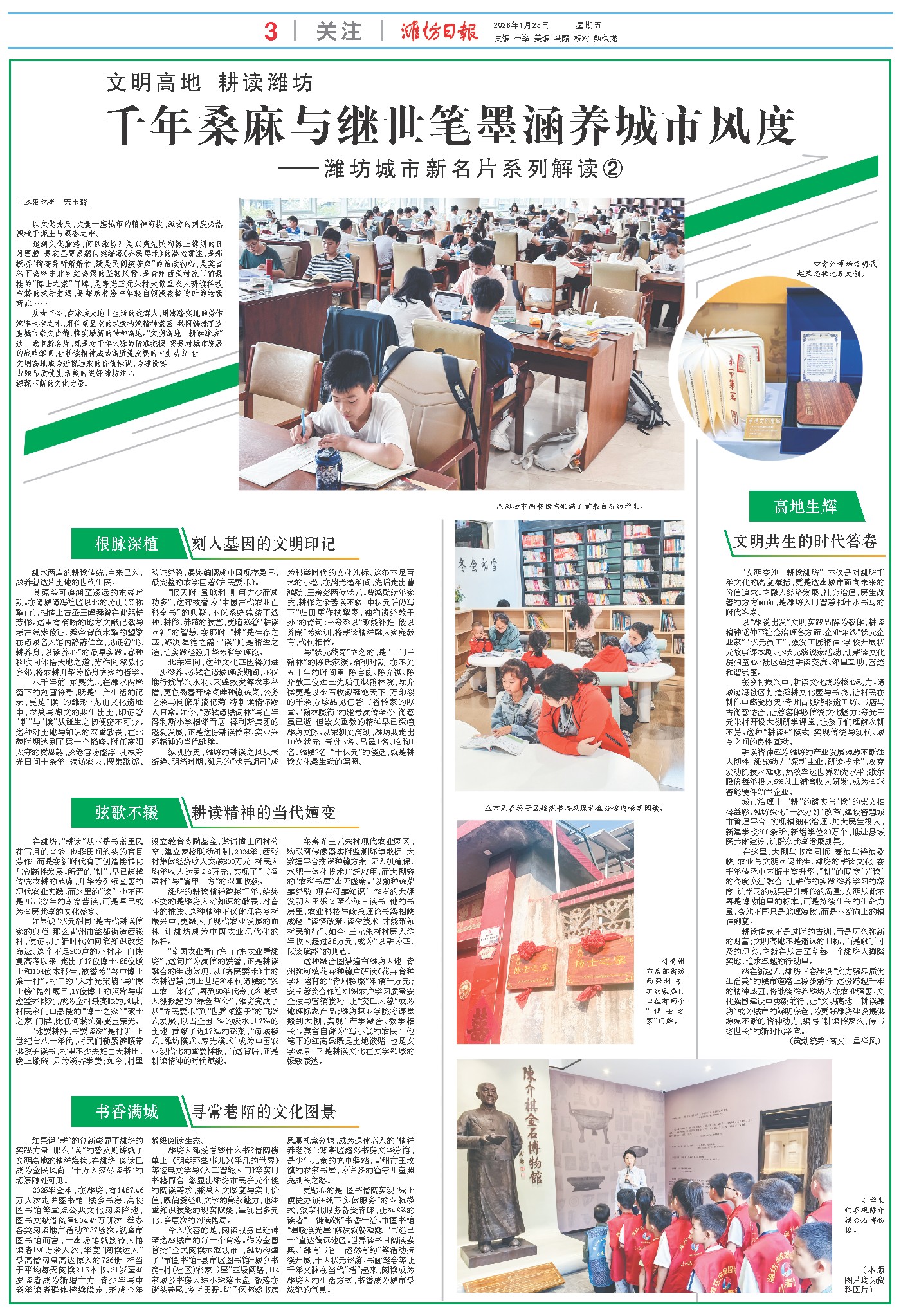 从古至今,在潍坊大地上生活的这群人,用脚踏实地的劳作筑牢生存之本,用仰望星空的求索构筑精神家园,共同铸就了这座城市崇文尚德、惟实励新的精神高地。“文明高地 耕读潍坊”这一城市新名片,既是对千年文脉的精准把握,更是对城市发展的战略擘画,让耕读精神成为高质量发展的内生动力,让文明高地成为近悦远来的价值标识,为建设实力强品质优生活美的更好潍坊注入源源不断的文化力量。