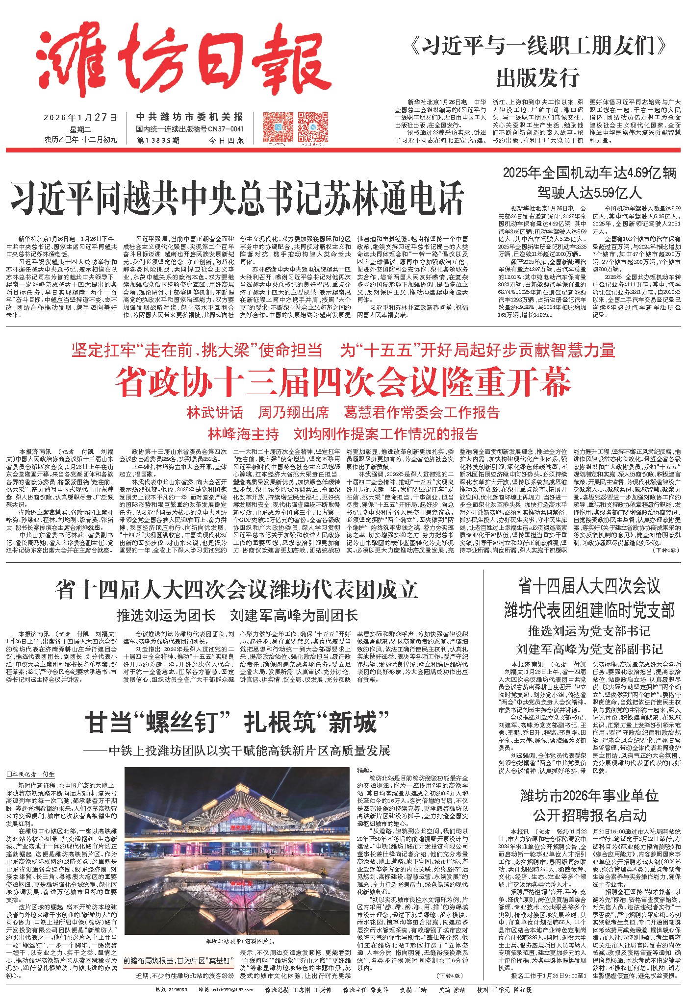 刘运指出,2026年是深入贯彻党的二十届四中全会精神、推动“十五五”实现良好开局的关键一年。开好这次省人代会,对于统一全省意志、汇聚各方智慧、坚定发展信心,组织动员全省广大干部群众凝心聚力做好全年工作,确保“十五五”开好局、起好步,具有重要意义。各位代表要自觉把思想和行动统一到大会部署要求上来,提高政治站位、强化政治担当、履行政治责任,确保圆满完成各项任务。要立足全省大局、发展所需,认真审议、充分讨论,讲真话、讲实情,议全局、议发展,充分反映基层实际和群众呼声,为加快强省建设积极建言献策。要以高度负责的态度、严谨细致的作风,依法正确行使民主权利,认真扎实地做好选举、表决等各项工作。要严守纪律规矩,发扬优良传统,树立和维护潍坊代表团的良好形象,为大会圆满成功作出应有贡献。