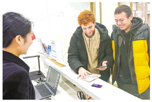 在重庆市渝中区解放碑离境退税集中退付点,来自西班牙的游客(中)在办理退税(1月7日摄)。