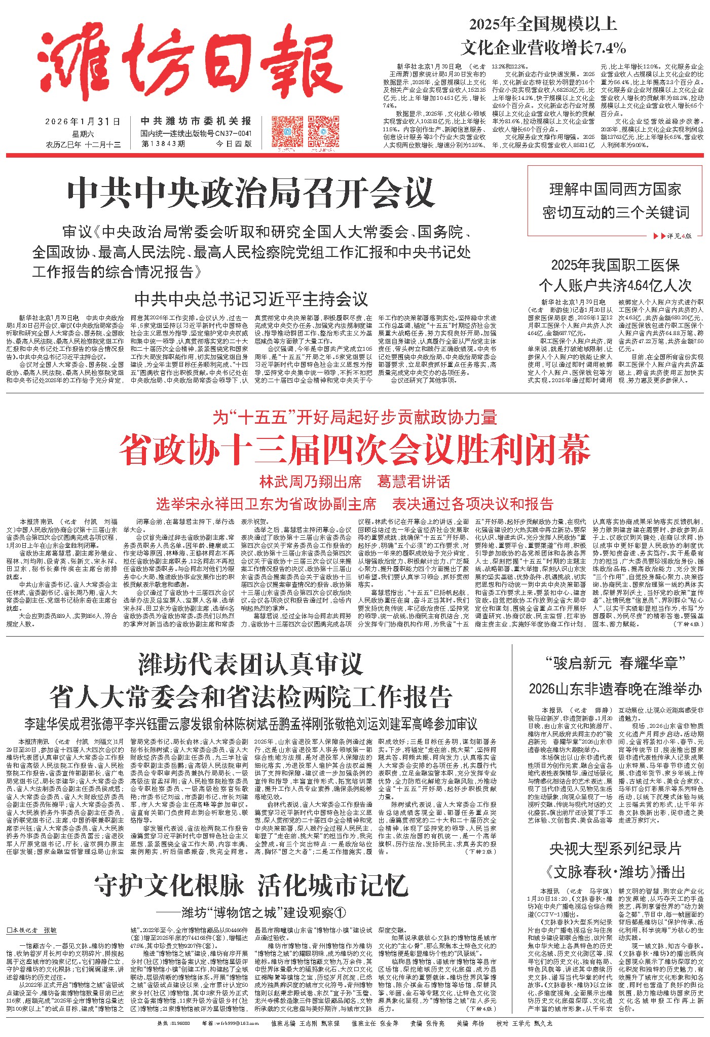 葛慧君指出,“十五五”已扬帆起航,人民政协重任在肩,奋斗正当其时。我们要发扬优良传统,牢记政治责任,坚持党的领导、统一战线、协商民主有机结合,充分发挥专门协商机构作用,为我省“十五五”开好局、起好步贡献政协力量,在现代化强省建设的火热实践中再立新功。要深化认识、增进共识。充分发挥人民政协“重要阵地、重要平台、重要渠道”作用,积极引导参加政协的各党派团体和各族各界人士,深刻把握“十五五”时期的主题主线、战略部署、重大举措,深刻认识山东发展的坚实基础、优势条件、机遇挑战,切实把思想和行动统一到中共中央决策部署和省委工作要求上来。要紧扣中心、建言资政。自觉把政协工作放到全省大局中定位和谋划,围绕全省重点工作开展好调查研究、协商议政、民主监督,扛牢协商主责主业,实施好年度协商工作计划,认真落实协商成果采纳落实反馈机制,努力做到建言建在需要时、参政参到点子上、议政议到关键处,在商以求同、协以成事中更好彰显人民政协的制度优势。要知责奋进、务实笃行。实干是最有力的担当,广大委员要珍视政治身份、锤炼政治品格、提高政治能力,充分发挥“三个作用”,自觉投身凝心聚力、决策咨询、协商民主、国家治理第一线的具体实践,深耕界别沃土,当好党的政策“宣传者”、社情民意“信息员”、界别群众“贴心人”,以实干实绩彰显担当作为,书写“为国履职、为民尽责”的精彩答卷。要强基固本、蓄力赋能。坚持以改革创新精神推进履职能力建设,深入学习贯彻习近平总书记关于加强和改进人民政协工作的重要思想,不断增强政治把握能力、调查研究能力、联系群众能力、合作共事能力。要牢固树立和践行正确政绩观,坚持协商于民、协商为民,把人民政协为人民的底色擦得更亮。要始终保持昂扬向上精气神,让主动谋事、协力成事在政协蔚然成风。