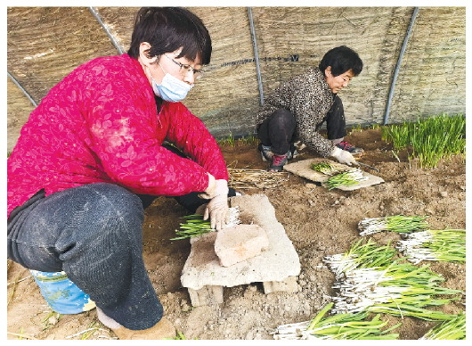 图为村民在整理刚收割的韭菜。