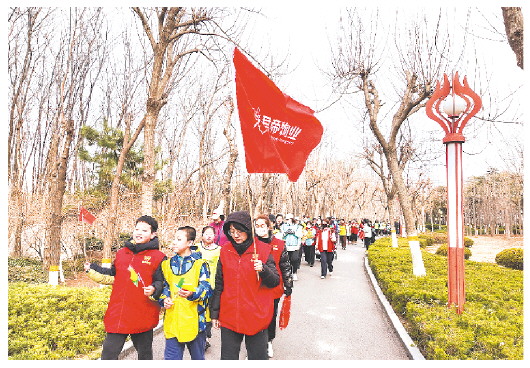 随着天气渐暖,许多市民选择与家人或亲友走出家门,来到公园、绿地等活动场所,在阳光与微风下感受春天的惬意。图为3月8日,市民组团来到城区虞舜公园,开展徒步、做游戏等活动。