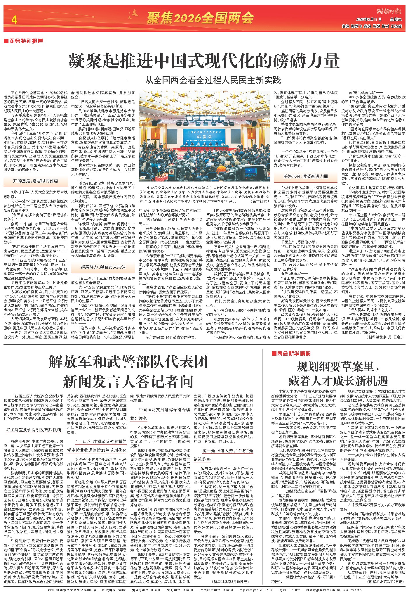 正在进行的全国两会上,约5000名代表委员带着田间地头的调研心得、街巷社区的民意民声、基层一线的所思所想,共商推进中国式现代化大计,铺展出践行全过程人民民主的生动画卷。
