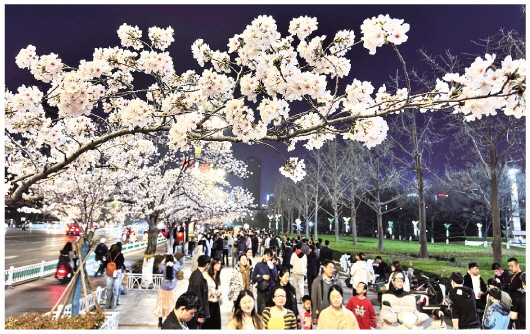 3月26日夜间,在市人民广场,人们正在欣赏盛开的樱花。春光明媚,花开应时,随着气温渐暖,市人民广场的樱花陆续盛开。在风筝都,“人民广场赏樱花”已成为一年一度的一件盛事,每年樱花开放季,广场的樱花如雪似霞,远观近看皆成景,前来赏花的市民游客络绎不绝,形成花如海、人如潮的盛况。白天无暇赏花的人们,在夜间来到广场,欣赏不一样的美景,夜色中的樱花在光的映衬下,呈现出独特的美。