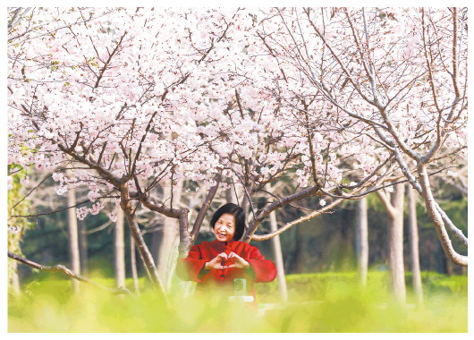 3月25日,游客在高密市凤凰公园直播春景。随着气温回升,各地景美如画,神州大地春色满满。 (新华社发)